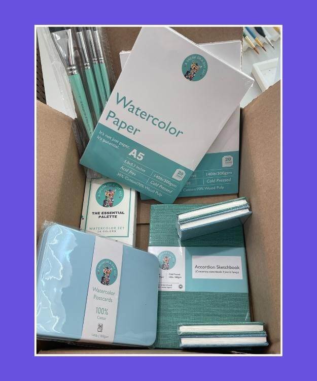 The Black Friday Bundle (no longer available) included the 24-Color Watercolor Half Pan Set, the Essentials 4-Brush Set, the cutest Blue Tin of 100% Cotton Watercolor Postcards, and the larger-sized Accordion Sketchbook. I also purchased 2 of the mini accordion sketchbooks and 2 of the Watercolor Paper Pads in the A5 size.