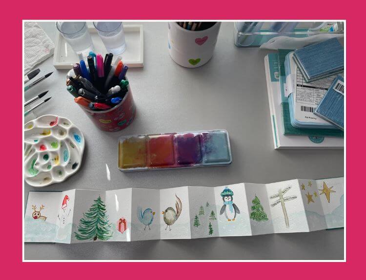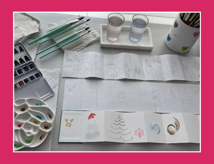 - Paint a set of tiny holiday watercolor motifs on a small accordion watercolor sketchbook