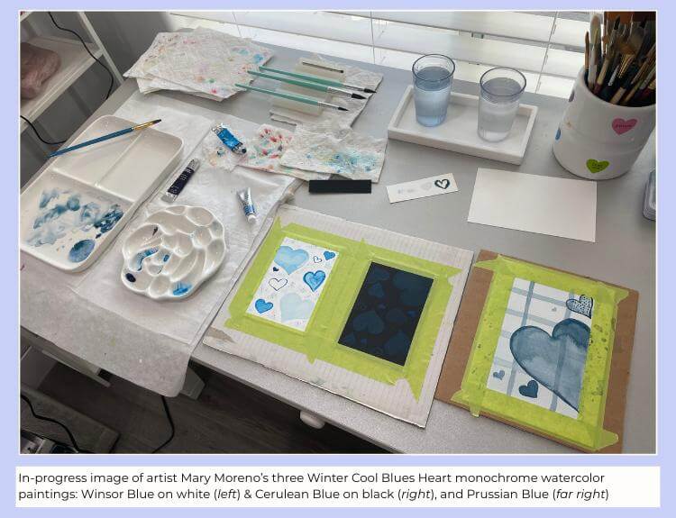Photo showing artist Mary Moreno's taped-down Cool Blues Heart watercolor paintings in progress, together with blue watercolor tubes and mixing palettes.