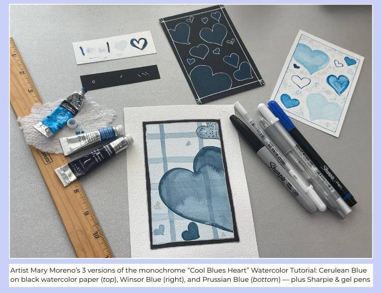 Photo showing artist Mary Moreno's completed 3 versions of the monochrome Cool Blues Heart Watercolor Tutorial, alongside ruler, paint tubes, and assorted pens.